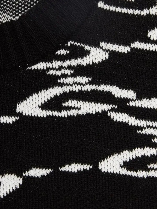 Il maglione nero e avorio di Gucci è realizzato in morbido cotone e decorato con un motivo jacquard ondulato con il logo GG, che riflette l'interpretazione moderna dei capi essenziali in maglia della maison.